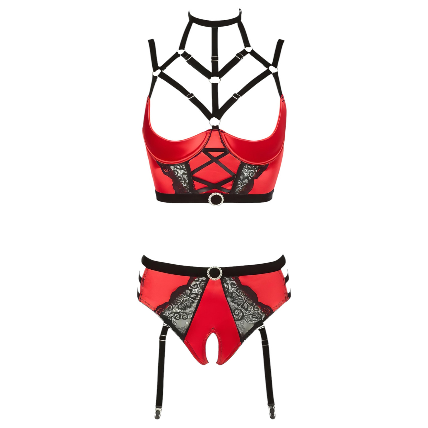 Το ενισχυμένο, ελαφρώς επενδεδυμένο σουτιέν ανυψώνει το στήθος και διαμορφώνει εκπληκτικά το ντεκολτέ, ενώ το ανοιχτό κάτω μέρος μπορεί να φορεθεί κατά τη διάρκεια της πράξης. Οι ιδιαίτερες λουρίδες, οι λαμπερές στρας και οι μεταλλικοί κρίκοι προσδίδουν έναν συναρπαστικό, αλλά κομψό χαρακτήρα. Αυτό το σετ είναι ο τέλειος συνδυασμός αυτοπεποίθησης και αισθησιασμού.
