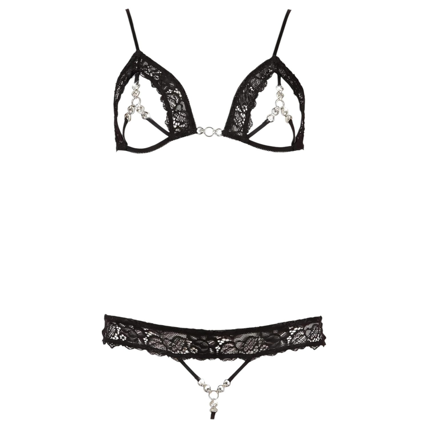 Το σετ δαντέλας με στρας είναι μια πραγματική ιδιαιτερότητα που αναδεικνύει τη θηλυκότητα και προσφέρει αυτοπεποίθηση. Το ανοιχτό κάτω μέρος και το εστιασμένο τμήμα του μπούστου είναι ταυτόχρονα τολμηρά και προκλητικά, ενώ το μαλακό, ελαστικό ύφασμα προσφέρει άνεση. Το λεπτομερής σχέδιο της δαντέλας ενισχύει την αίσθηση πολυτέλειας του σετ.
