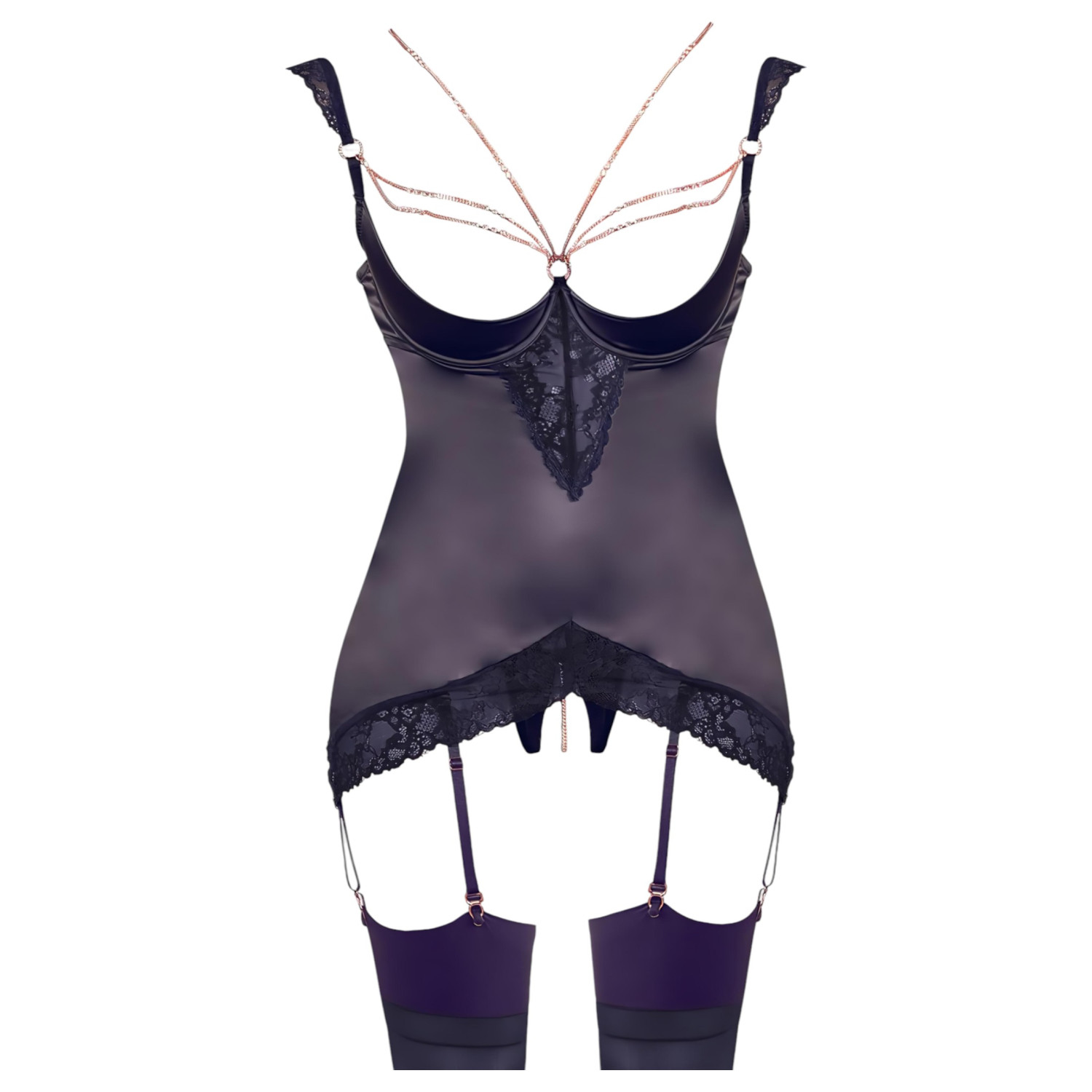 Αυτό το ιδιαίτερο σετ είναι ο τέλειος συνδυασμός θηλυκότητας και σεξουαλικής κομψότητας. Ο ενισχυμένος σχεδιασμός διαμορφώνει όμορφα το στήθος, ενώ η αλυσίδα με στρας αναδεικνύει το ντεκολτέ σαν πραγματικό κόσμημα. Το ελαφρώς ελαστικό, άνετο υλικό εξασφαλίζει όχι μόνο ένα αισθησιακό, αλλά και άνετο φόρεμα.