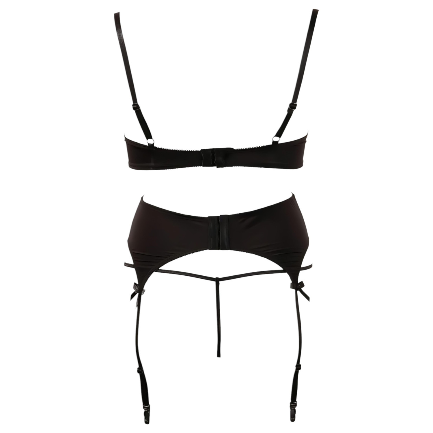 Φόρεσε το σουτιέν, ρύθμισε τις τιράντες για τέλεια εφαρμογή, και στη συνέχεια στερέωσε τις ζαρτιέρες με τις αγαπημένες σου κάλτσες. Τέλος, συμπλήρωσε το σετ με το ανοιχτό εσώρουχο - ολοκληρώνοντας την ελκυστική και ρομαντική εμφάνιση.