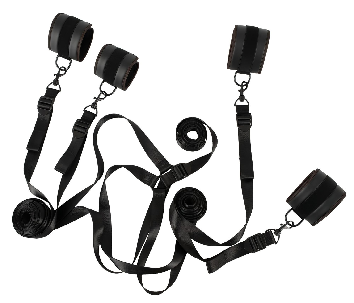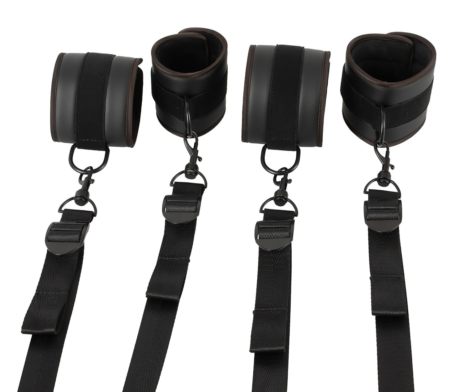 Πέρασε το μακρύ λουρί κάτω από το στρώμα ή το πλαίσιο του κρεβατιού σου, παράλληλα με το μήκος του, και τράβα τα τέσσερα κομμάτια των λουριών ώστε να βγαίνουν πάνω από το στρώμα - εκεί θα συνδέσεις τις μανσέτες με τα καραμπίνερ. Σύνδεσε τις μανσέτες για χέρια και πόδια και είσαι έτοιμος/η για παιχνίδι!