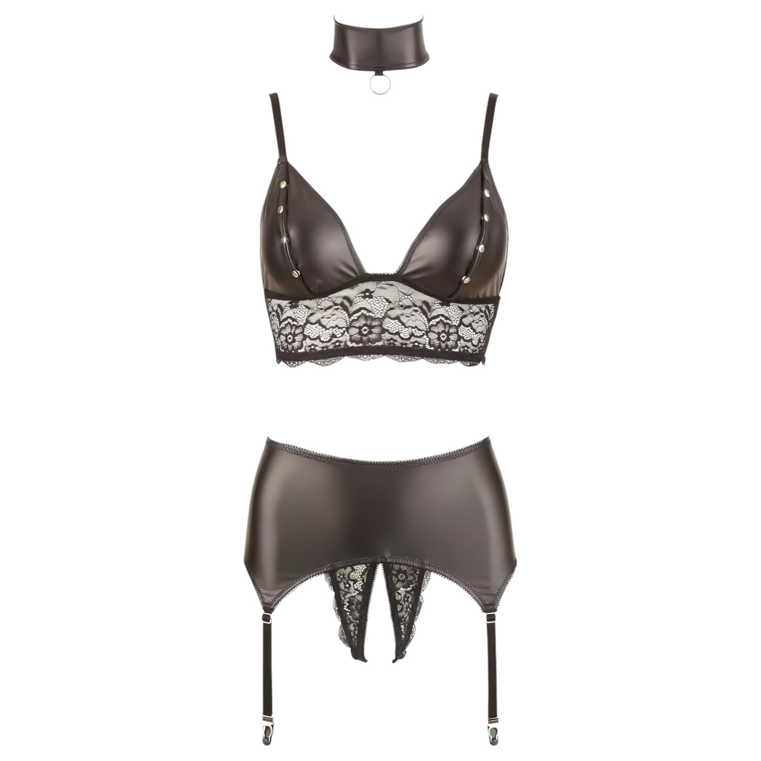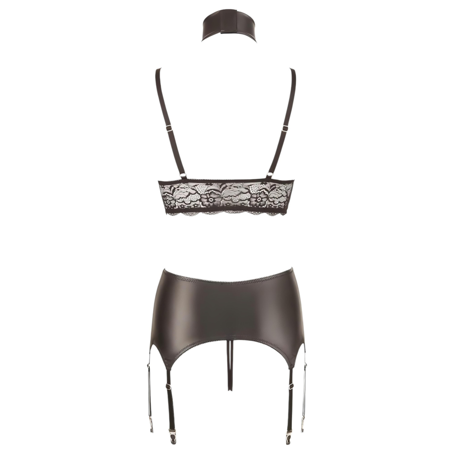 Καυτό, γυαλιστερό σετ εσώρουχα με απαλή δαντέλα, χειροπέδες και λουράκι λαιμού - για παθιασμένες στιγμές μαζί!