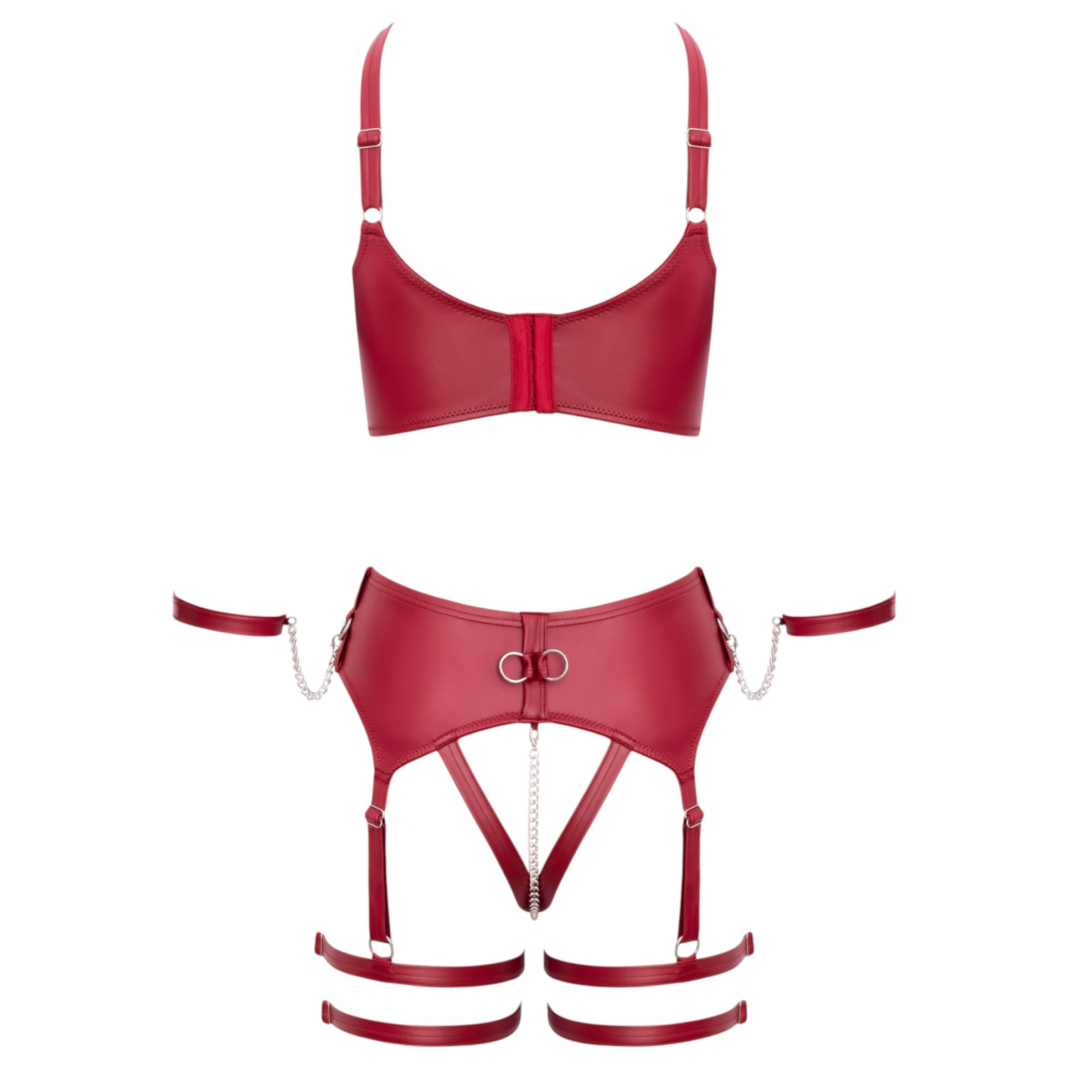 Το σετ Cottelli Bondage με σταυρωτούς ιμάντες προσφέρει την τέλεια αρμονία πάθους και πρόκλησης. Το σετ περιλαμβάνει έναν στράπλες στηθόδεσμο, ένα ανοιχτό σλιπ σε στυλ ζαρτιέρα και ένα ζευγάρι απαλές χειροπέδες. Η ζωηρή, σκούρα κόκκινη ματ εμφάνιση προσφέρει εκλεπτυσμένη και αισθησιακή εμφάνιση. Ο στηθόδεσμος είναι άνετος και ρυθμιζόμενος, ενώ το κόψιμο του εσώρουχου με αλυσίδα παρέχει δυνατότητα συναρπαστικού παιχνιδιού. Η ιδιαιτερότητα του σετ είναι οι διακοσμητικοί κρίκοι και οι συνδεδεμένες χειροπέδες, που δημιουργούν ακόμα πιο θερμή ατμόσφαιρα.