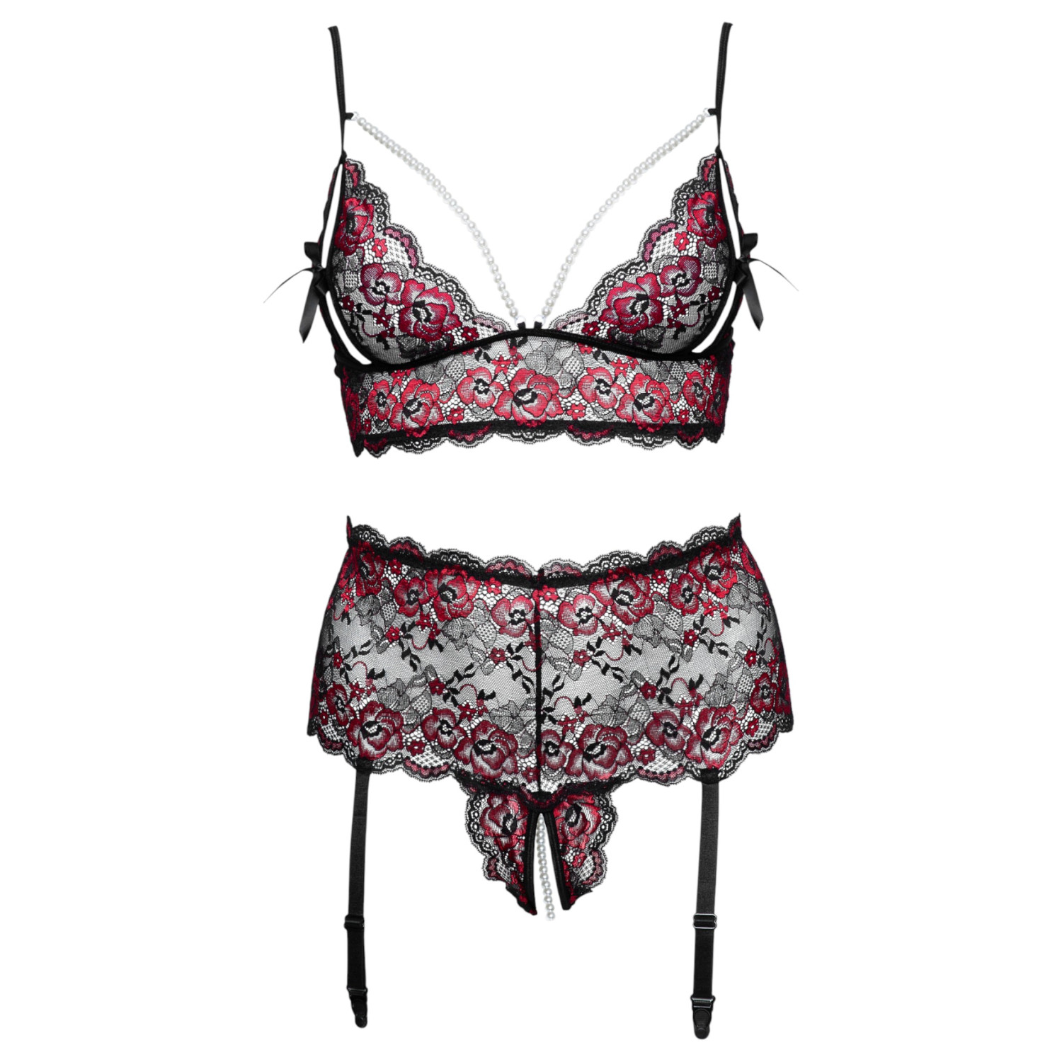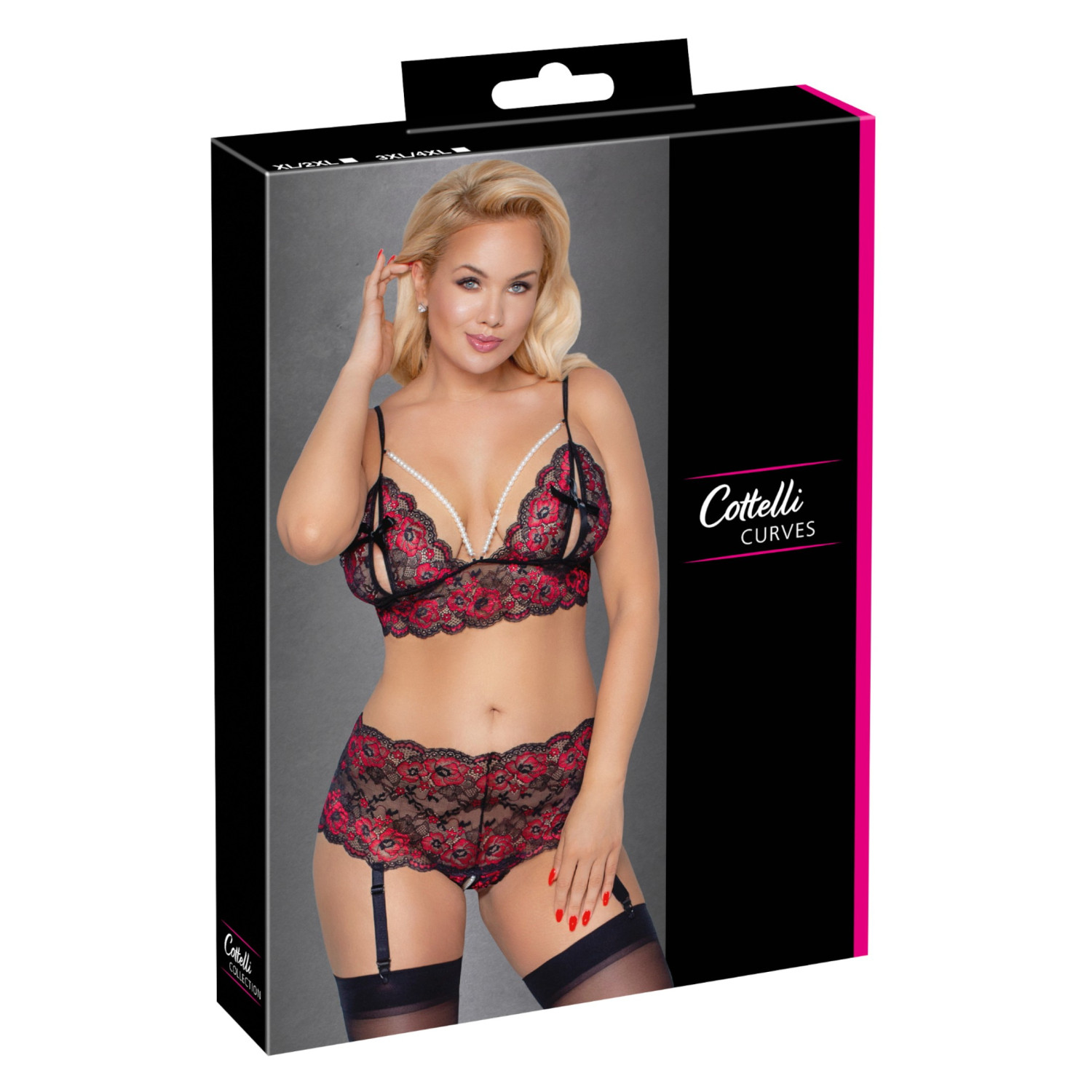 Το Cottelli Curves - σετ σουτιέν από δαντέλα με πέρλες και ανοιχτό στρινγκ με ζαρτιέρες είναι ένα εξαιρετικά ερωτικό σετ εσωρούχων, εξ ολοκλήρου από δαντέλα, το οποίο γίνεται πραγματικά ακαταμάχητο χάρη στις υπέροχες αλυσίδες με πέρλες, την ιδιαίτερη κοπή και τον ψηλόμεσο στρινγκ.