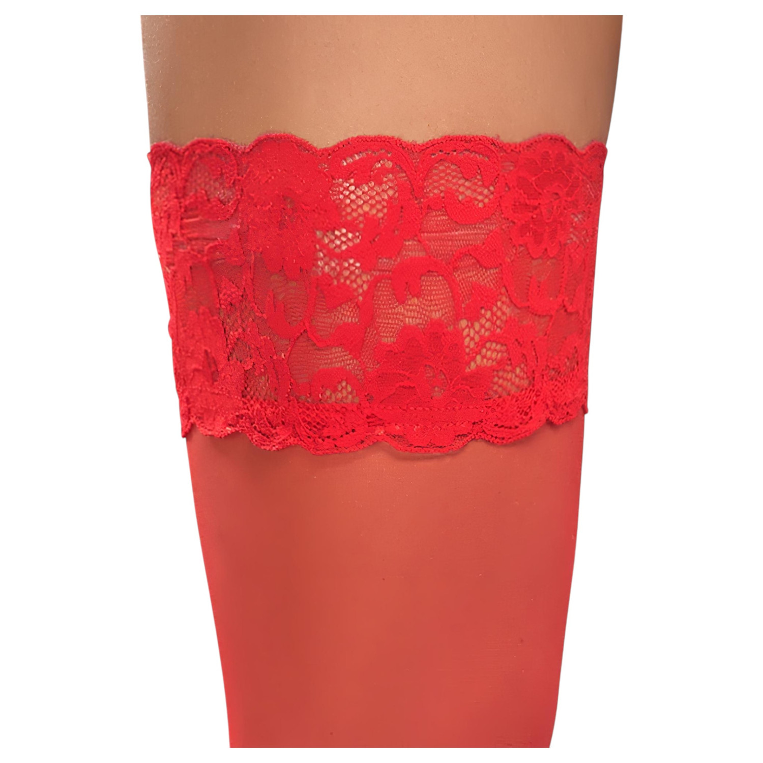 • 1 ζευγάρι κόκκινες κάλτσες με 9 εκ. δαντελένιο τελείωμα και ενίσχυση με σιλικόνη