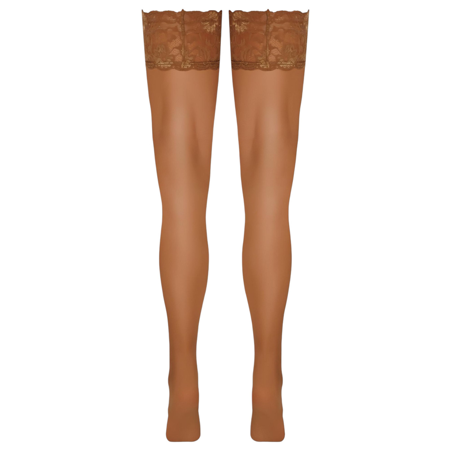 • 1 ζευγάρι φυσικές κάλτσες μέχρι τον μηρό με 9 εκ. δαντελένιο τελείωμα και σιλικονούχα ενίσχυση