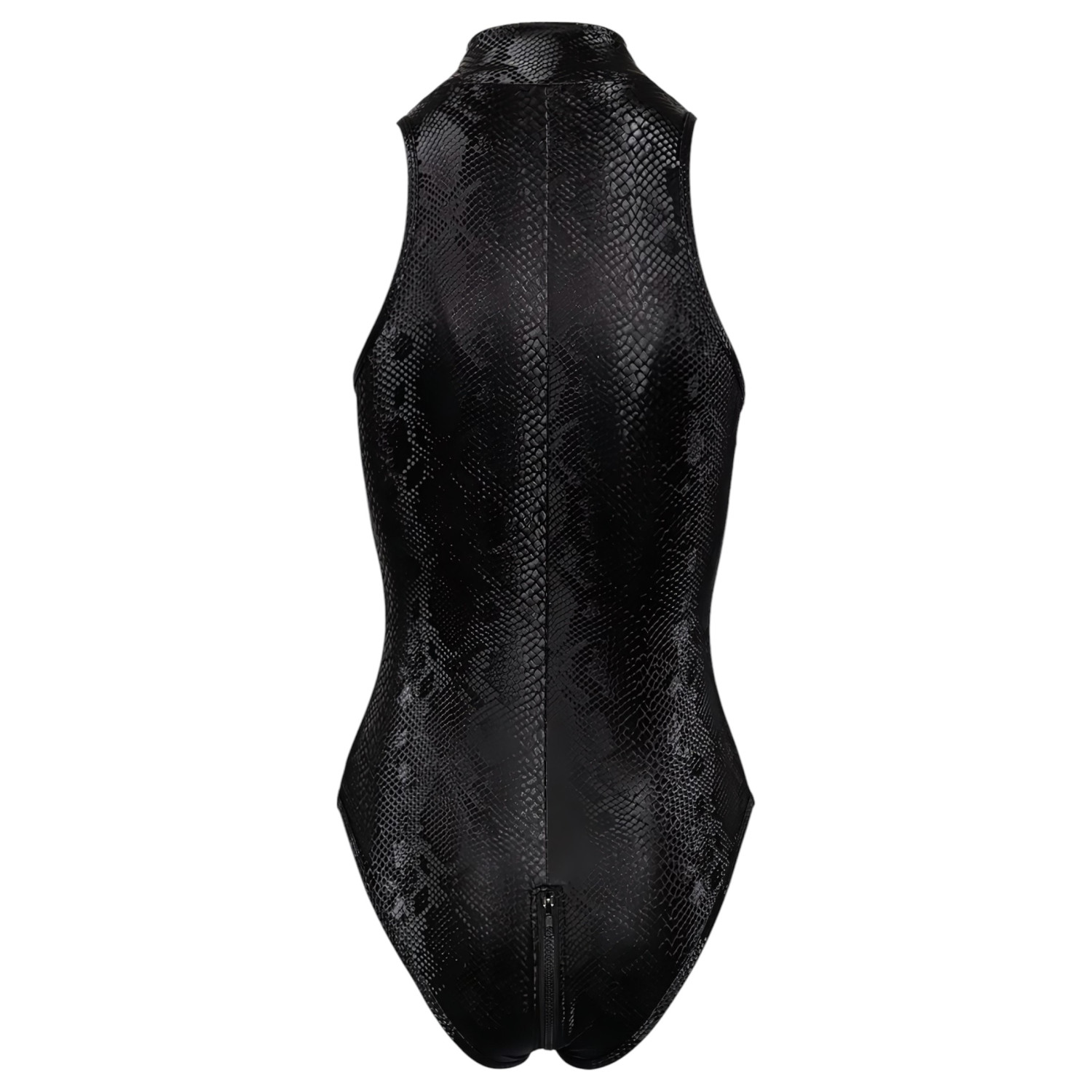 Ολόσωμο με σχέδιο φιδιού, ψηλό γιακά και διπλό φερμουάρ που ξεκινάει από το γιακά και φτάνει μέχρι τα οπίσθια! Η γυαλιστερή όψη του με το μοτίβο φιδιού θα σε κάνει ακαταμάχητα μυστηριώδη!