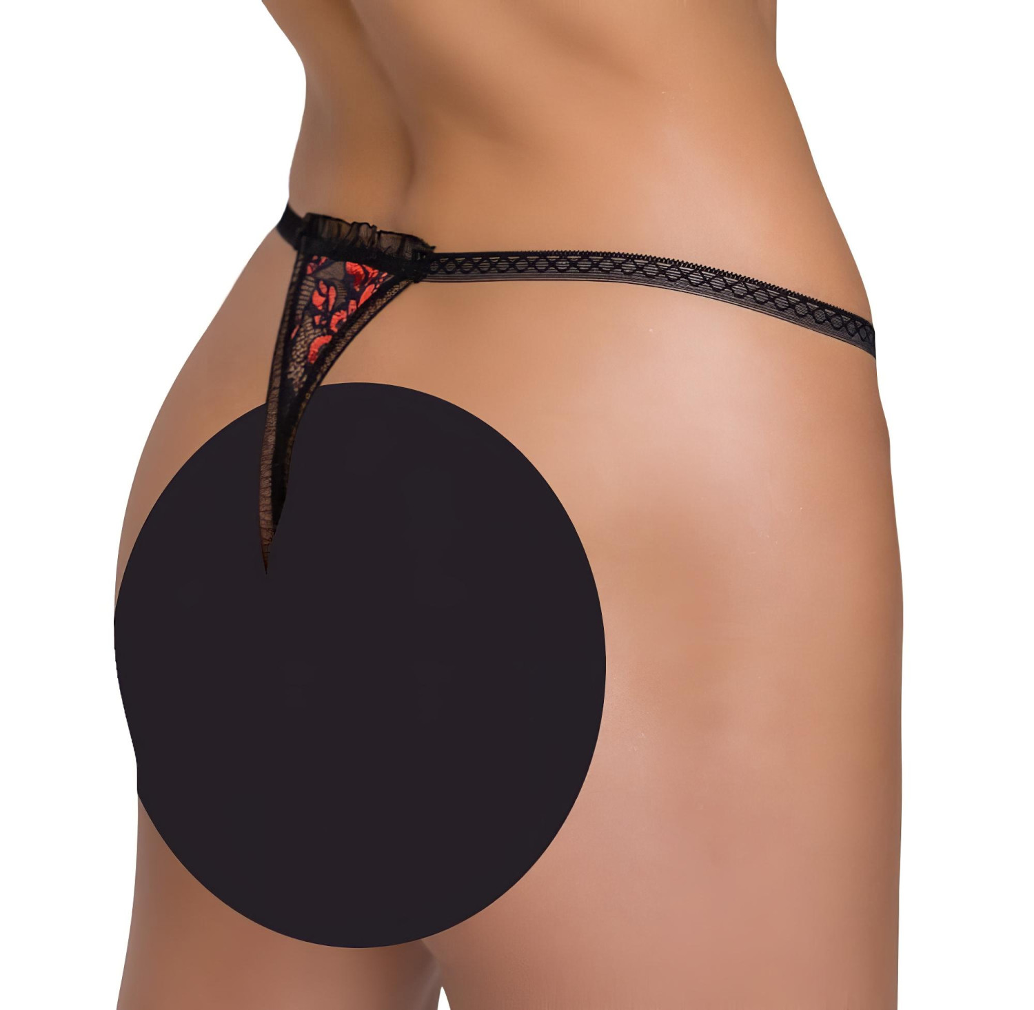 • 1 κομμάτι ημιδιάφανο, δαντελένιο στρινγκ με τριανταφυλλένιο κέντημα και αφαιρούμενη σειρά από πέρλες