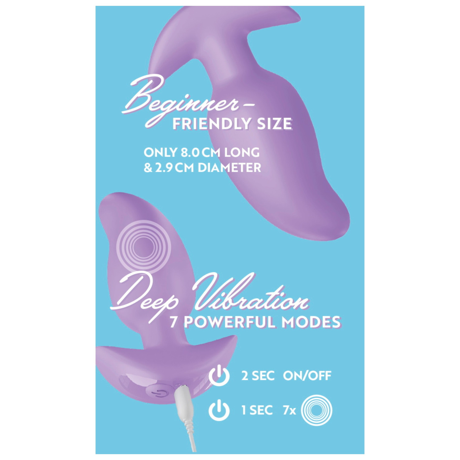 Χάρη στον μονοκουμπάτο έλεγχο, η χρήση του plug είναι εξαιρετικά απλή. Με σύντομη πίεση, αλλάξετε μεταξύ των δονητικών λειτουργιών, ενώ με μακριά πίεση, ενεργοποιείτε ή απενεργοποιείτε τη συσκευή. Ο συμπαγής σχεδιασμός καθιστά το κουμπί εύκολα προσβάσιμο κατά τη χρήση.