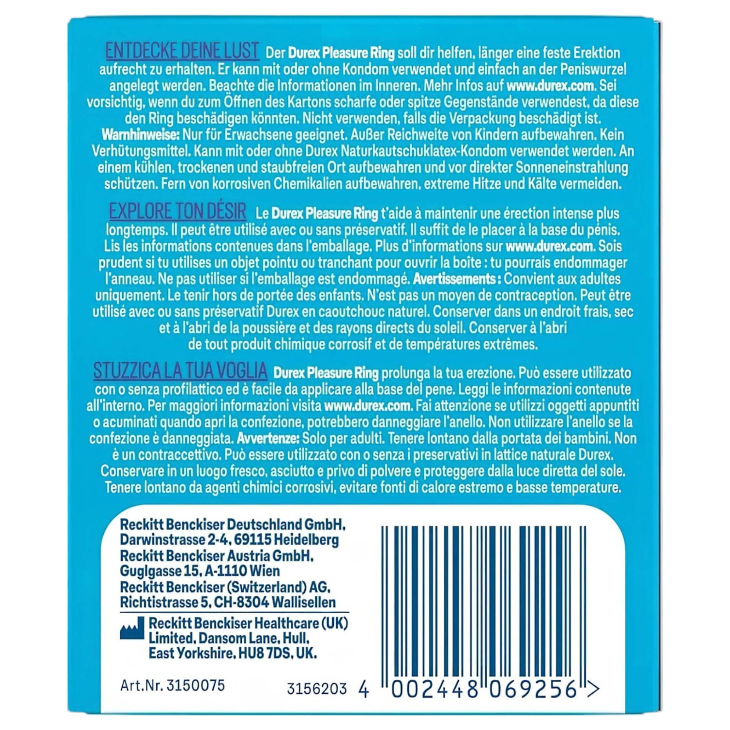 Το Durex Pleasure Ring σου επιτρέπει να απολαμβάνεις το σεξ για περισσότερη ώρα - με πιο σκληρή στύση και έντονη αίσθηση. Ο σχεδιασμός του είναι ελαστικός, με παχύ τοίχωμα, έτσι διατηρεί αποτελεσματικά τη ροή του αίματος και ταυτόχρονα προσφέρει άνεση. Το υλικό είναι από σιλικόνη, βελούδινο στην αφή, φιλικό με το δέρμα και πολύ εύκολο στο λιπάνσιμο.