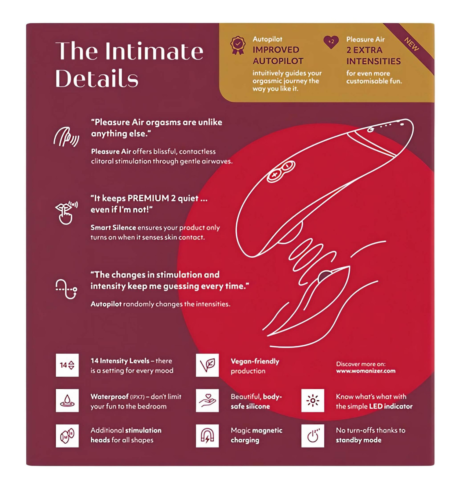 Το Womanizer Premium 2 συνδυάζει την πιο προηγμένη τεχνολογία κυμάτων αέρα, τη λειτουργία Smart Silence και τη λειτουργία Autopilot, προσφέροντας κάθε φορά μια μοναδική και αξέχαστη εμπειρία.