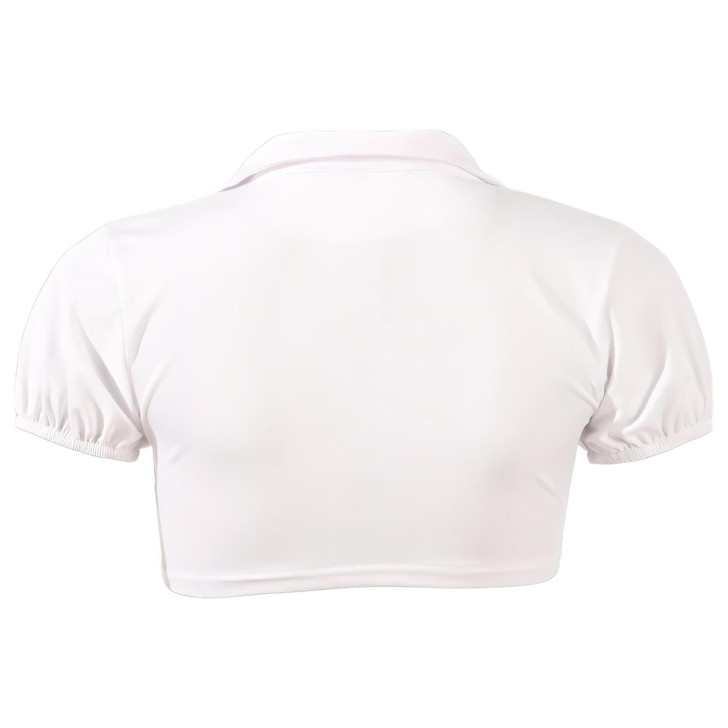 • Κοντό τοπάκι: Ελαστικό, λευκό ύφασμα, που δένει μπροστά και με βαθύ στρογγυλό ντεκολτέ που αναδεικνύει το μπούστο σου.