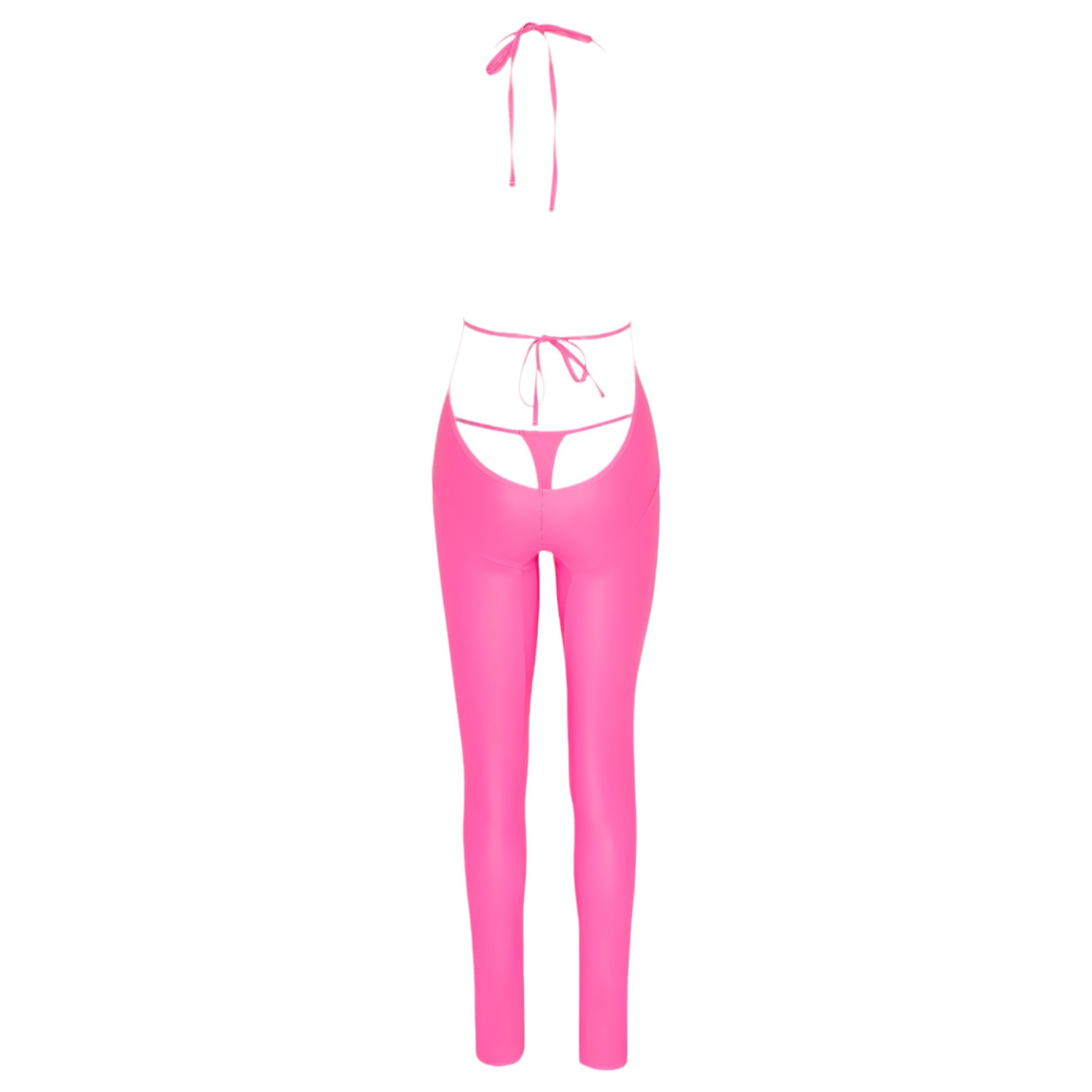 Ολόσωμη φόρμα με εντυπωσιακά ανοιχτή πλάτη και γυαλιστερή υφή, που τονίζει τη γραμμή της πλάτης με το ασορτί στρινγκ.