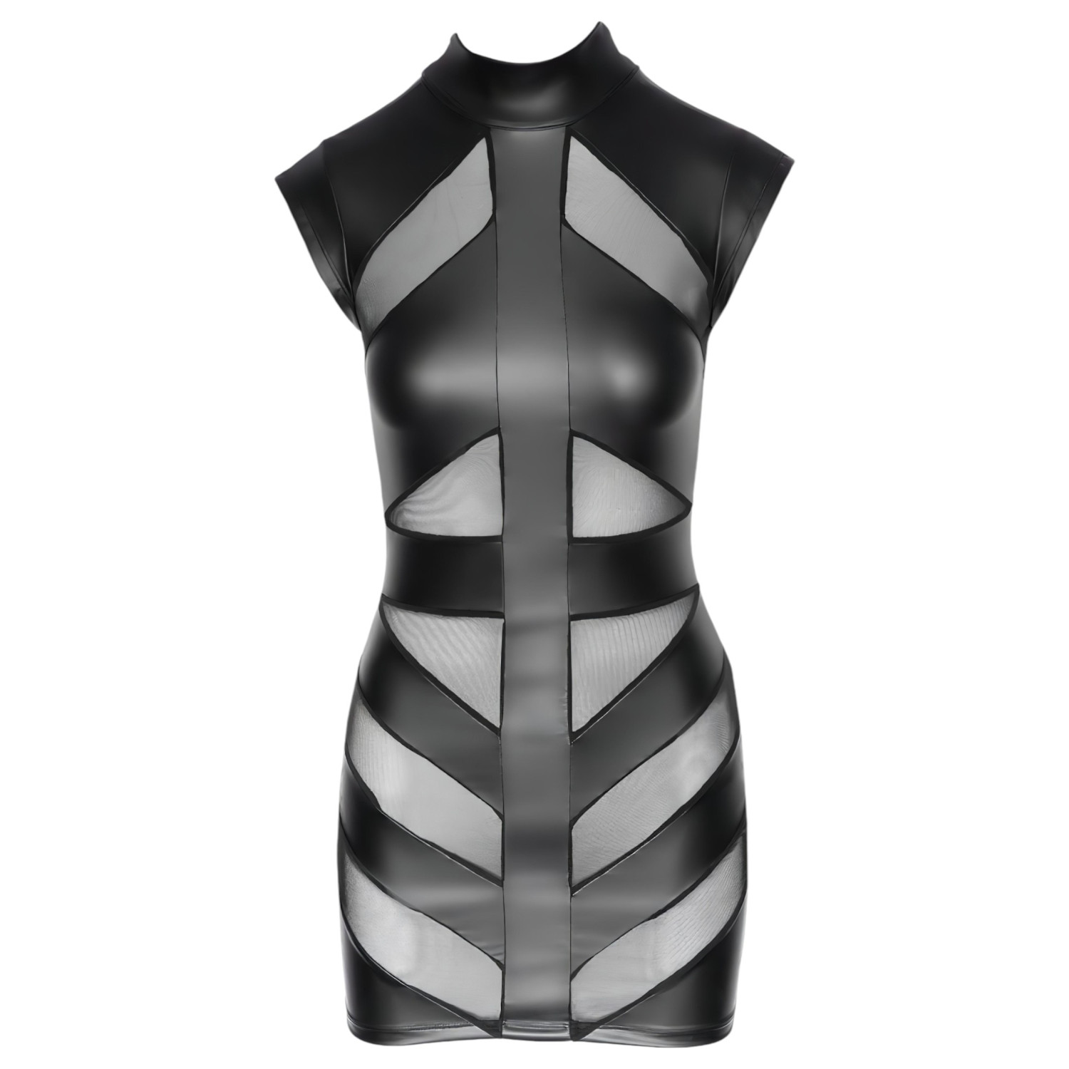 Αμάνικο, γυαλιστερό μαύρο φόρεμα με διαφανή νετ σχέδια σε λωρίδες - φόρεσέ το στην κρεβατοκάμαρα ή, αν νιώθεις τολμηρή, ακόμα και σε ένα άγριο πάρτι.