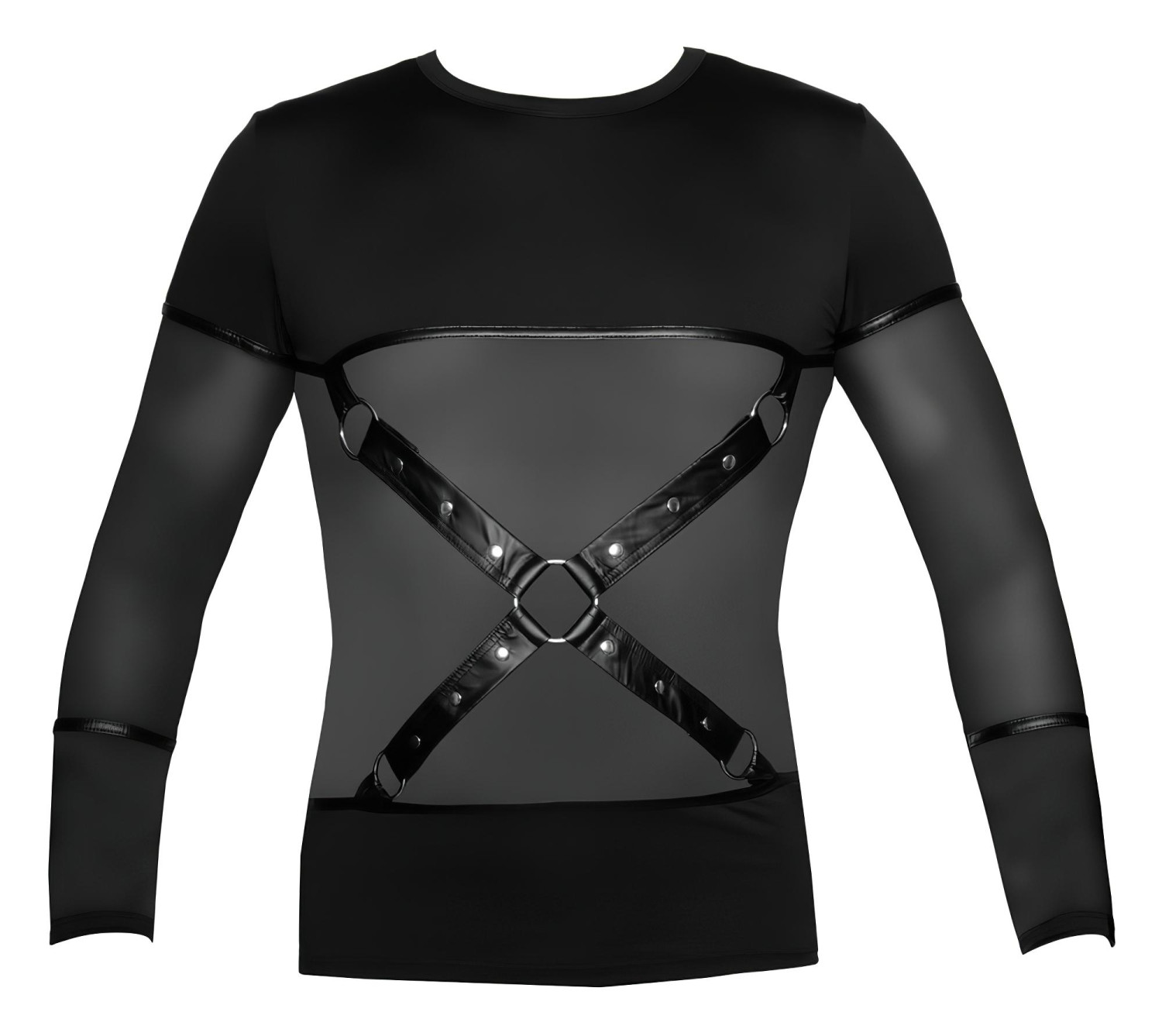 Σέξι, μεταξένια στην αφή, ανδρικό τοπ με σταυρωτές τιράντες και διαφανή λεπτομέρειες από δίχτυ.