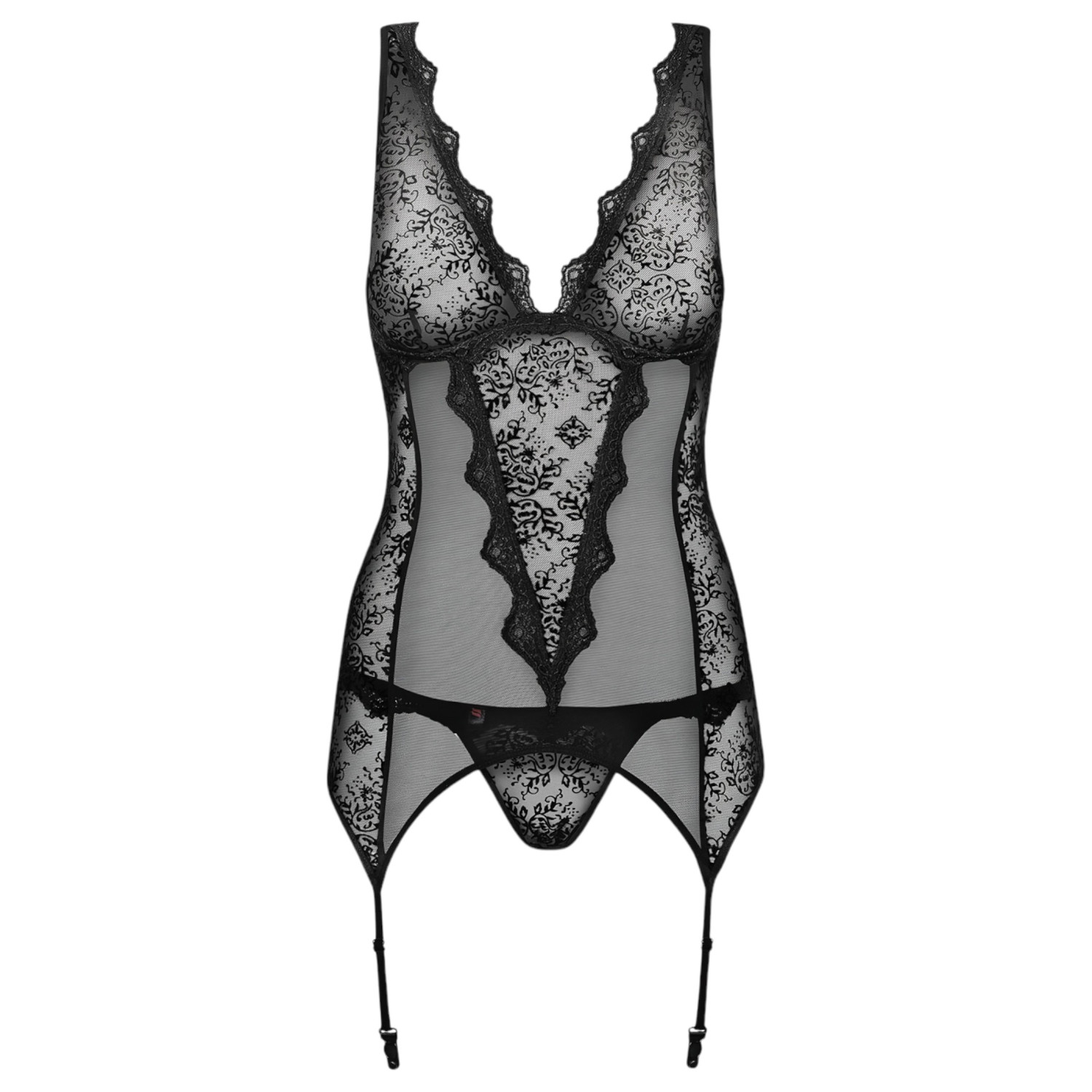 Εκλεπτυσμένο, σέξι στυλ με διαφανές ύφασμα και απαλές, βελούδινες κεντημένες λεπτομέρειες - αυτό το αποπλανητικό σετ ζαρτιέρας με μπλούζα και στρινγκ θα σε κάνει ακαταμάχητη!