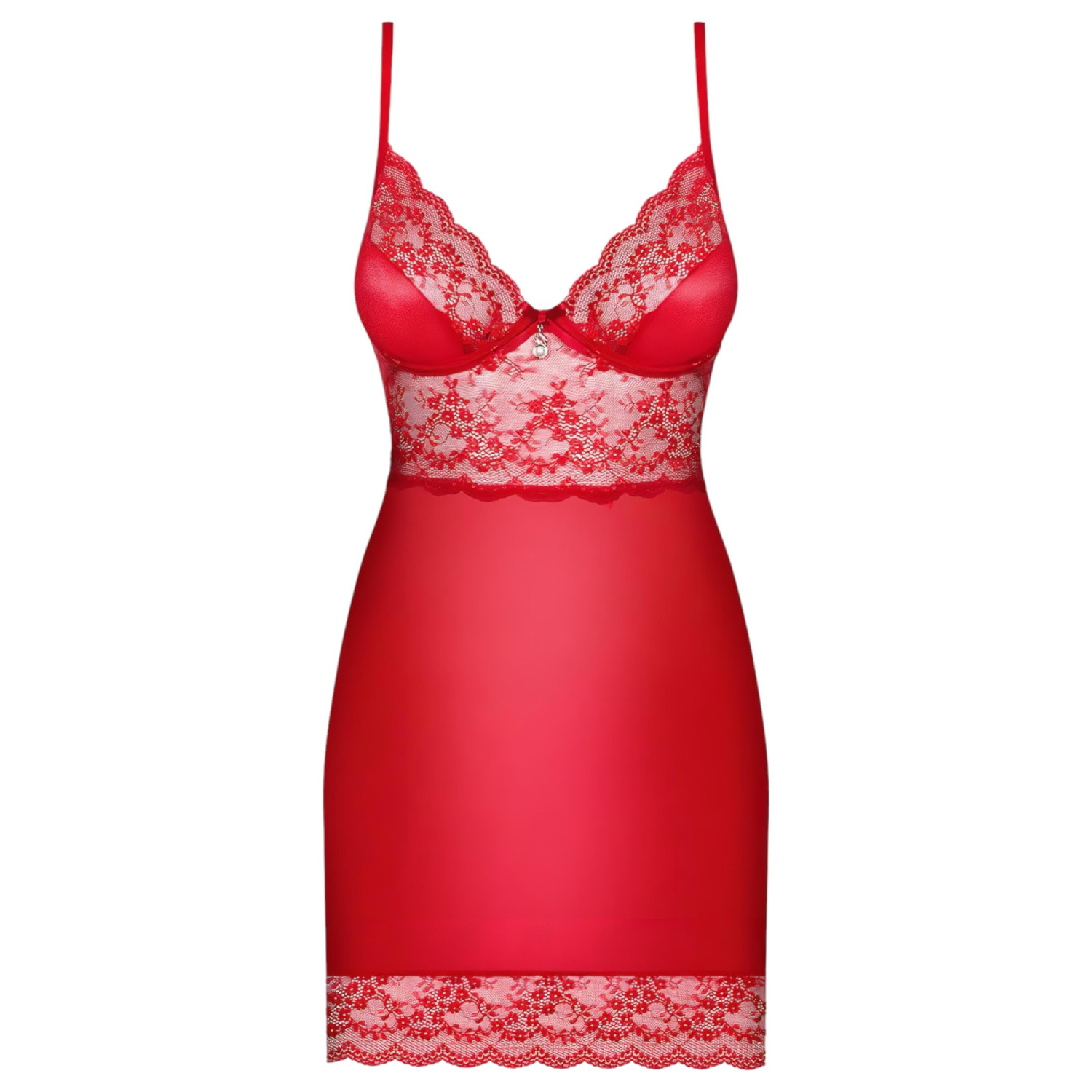 • 1 τεμ. κόκκινο νυχτικό με ενισχυμένο μπούστο, ρυθμιζόμενες τιράντες, διάφανες δαντελένιες λεπτομέρειες και λευκό διακοσμητικό με πέρλα