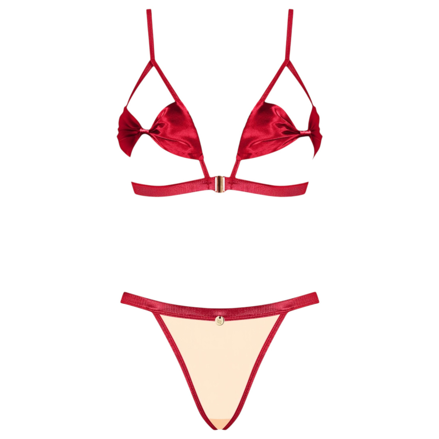 Το σετ Obsessive Rubinesa είναι ένα αισθησιακό και κομψό εσώρουχο, φτιαγμένο από κόκκινο σατέν με χρυσές λαμπερές λεπτομέρειες και ανοιχτή σχεδίαση με φιόγκους.