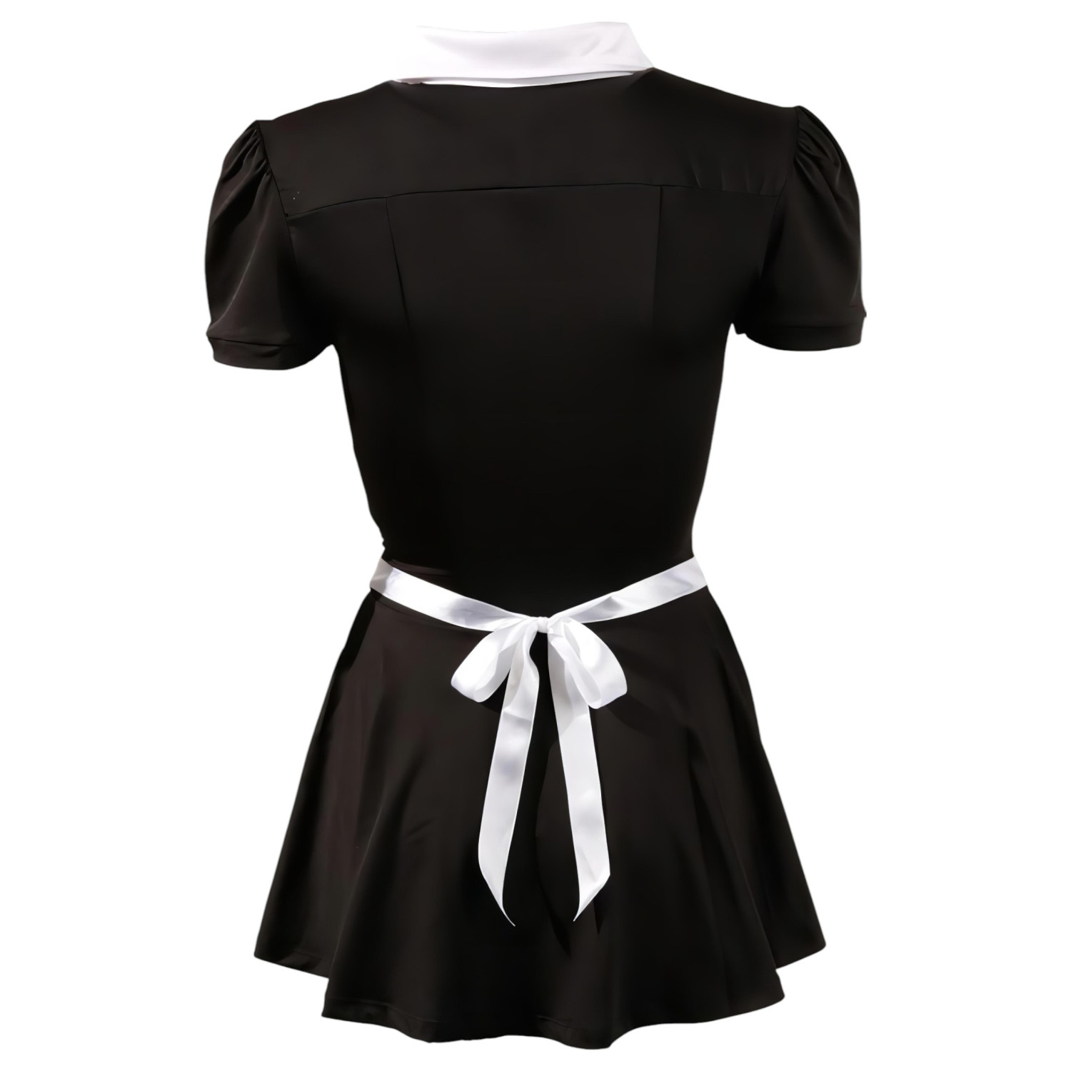 Αυτό το γοητευτικό μαύρο μίνι φόρεμα φέρνει στο νου το στιλ της υπηρέτριας, ιδανικό για μια σέξι και παιχνιδιάρικη εμφάνιση.