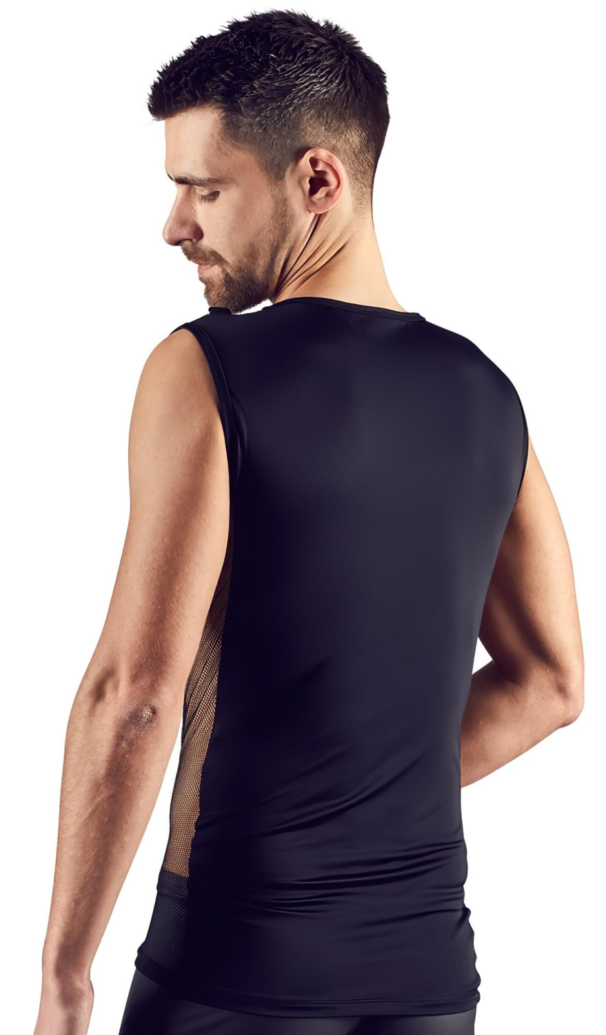 Ανδρικό τοπ με μεταξένια αίσθηση, διαφανείς λεπτομέρειες στα πλάγια και μοτίβο με κορδόνια στο στήθος.