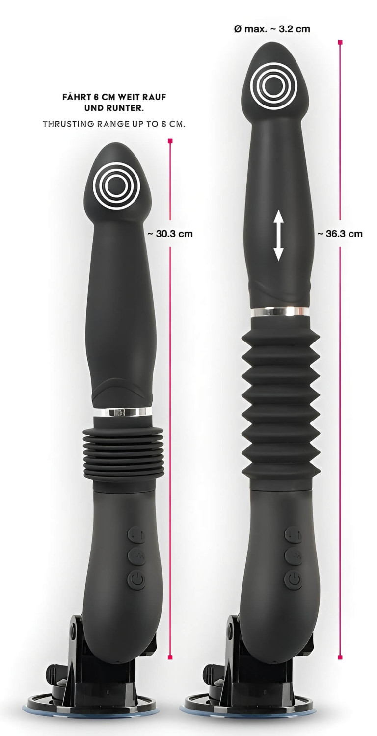 Στερέωσε το δονητή στην βεντούζα αφού ανοίξεις το καπάκι σιλικόνης κάτω από το σήμα CE, και ρύθμισέ το στη γωνία που σε βολεύει. Πίεσέ το σε μια σταθερή, λεία επιφάνεια και απόλαυσε hands-free παιχνίδι. Ρύθμισε την ταχύτητα ώθησης και το πρόγραμμα δόνησης είτε απευθείας στη συσκευή, είτε με το ασύρματο τηλεχειριστήριο.