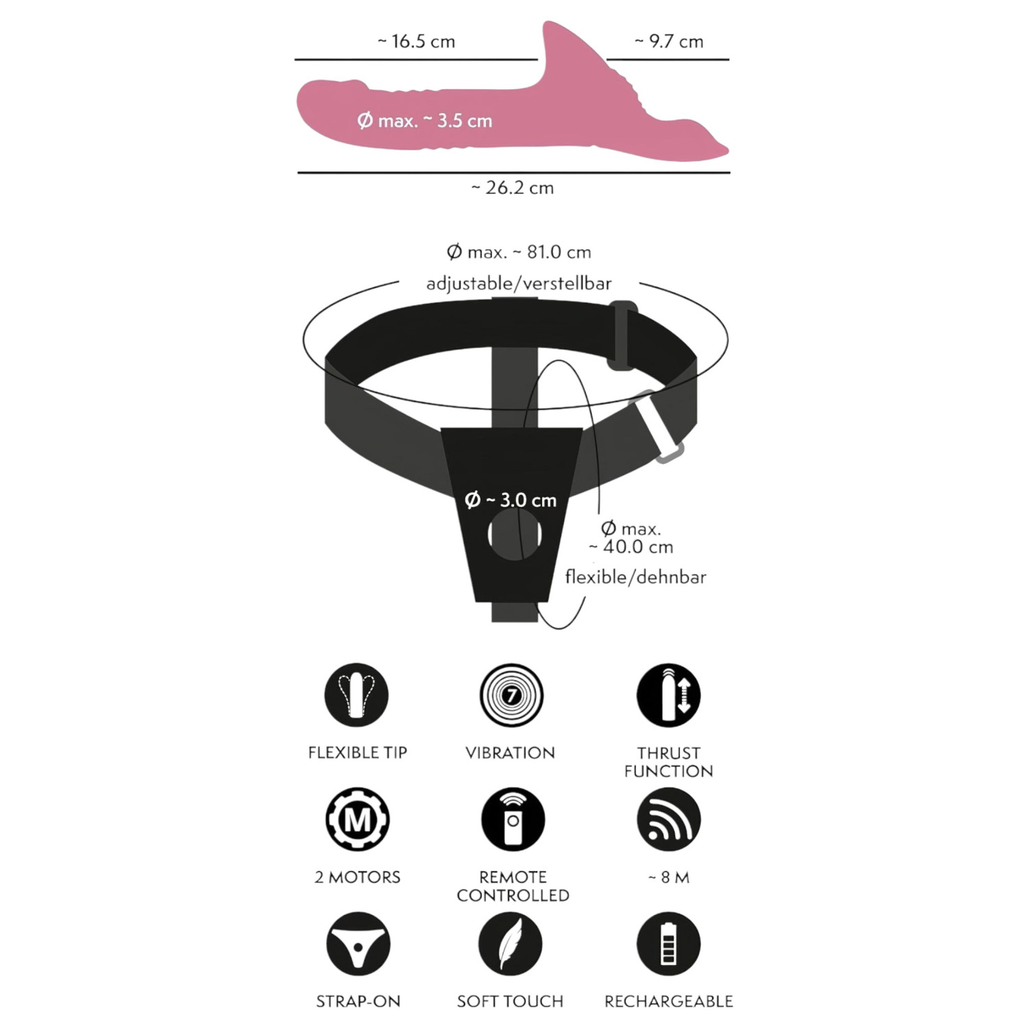 • Υγιεινή: Πλύνε με προσοχή τον δονητή και τη ζώνη πριν και μετά τη χρήση, για να διατηρήσεις την καθαριότητα.